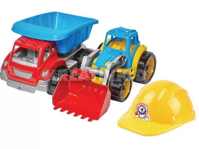 A Műanyag dömper, traktor és sisak készlet csomagolási méretei: 56 x 37 x 34 cm.