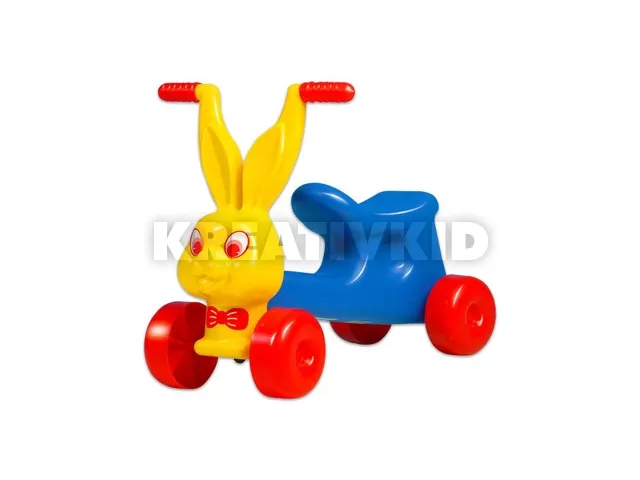 Nagyon aranyos, egyszerű felépítésű, műanyagból készült nyuszi formájú lábbal hajtós kismotor. Az első kerék kormányozható, és műanyagból készült. Ülésmagasság: 21 cm. Méretek: 46 x 29 x 37 cm.