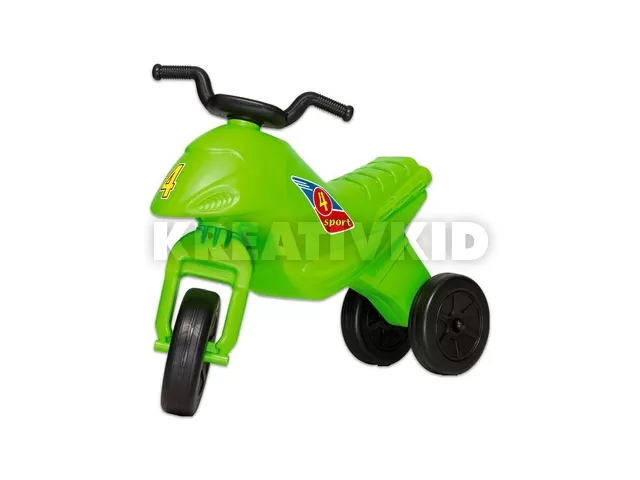 Vagány, egyszerű felépítésű, műanyagból készült zöld lábbal hajtós kismotor. Az első kerék kormányozható, és műanyagból készült, a motor matricákkal van díszítve. Méretek: 60 x 28 x 44 cm. A motor 4-es méretkategóriába tartozik. Ülésmagasság: 29 cm.
