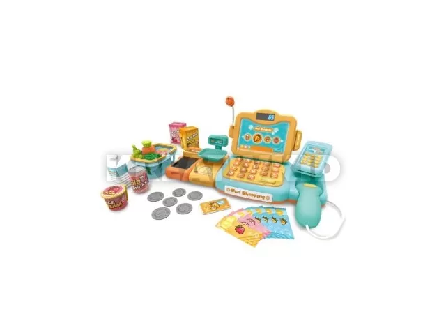 Mulifunkciós pénztárgép szett hanghatással - 24 db-os. A dobozban 1 db pénztárgép található számológéppel és bankkártyával, szkennerrel, nyitható rekesszel és mikrofonnal. A szett része többfajta étel, pénz és bankkártya. A pénztárgép hangot is ad.