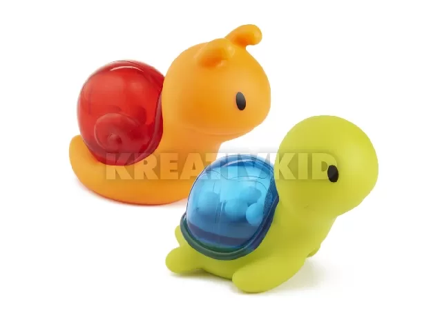 Rázza meg, csörgesse, és tegye a fürdõt a nap legszórakoztatóbb idõszakává. Ezek az aranyos állatok nem csak vizet spriccelnek, hanem csörögnek is! Tökéletes minden korosztály számára, remek elsõ fürdõjáték!