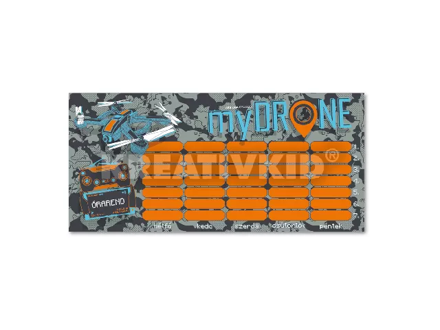 Kétoldalas, magyar nyelvű órarend A és B hét beosztással. 250 gr-os félfényes műnyomó papírra, 4 szín nyomással nyomott.