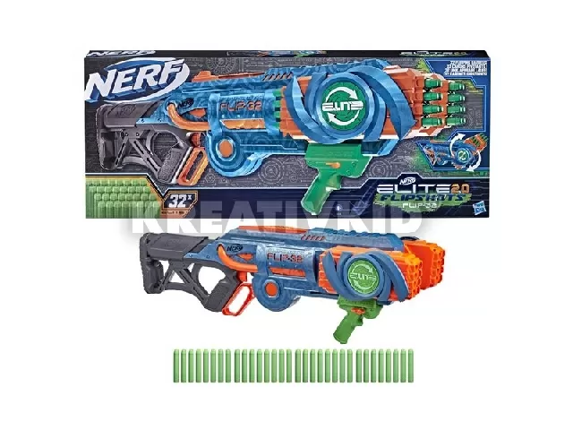 Új forgó forma és funkciókészlet, amelyet akciódús játékokhoz terveztünk. Az ünnepi időszak sztárja a Flip 32 kilövő, amibe 32 szivacslövedék fér. A csövek végén két tár van, bennük 16 lövedék. A kétfokozatú ravasszal egyszerre egy vagy két szivacslövedéket lőhetsz ki. De ez még nem minden! Amíg lősz, újratöltheted a feléd eső másodlagos tárakat, így mindig készen állhatsz. Amikor elfogytak a szivacslövedékek, a zöld karral átválthatsz a következő 16-os tárra, és folyhat tovább a csata!