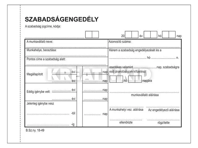 Nyomtatvány, szabadságengedély, 50x2, A6, VICTORIA PAPER "B.18-49", 10 tömb/csomag