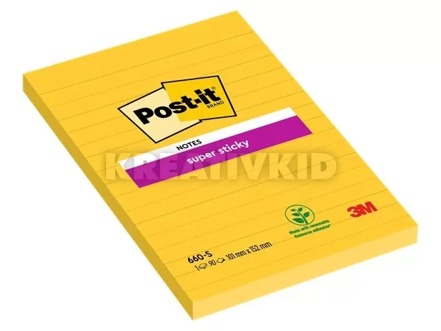 Öntapadó jegyzettömb, 102x152 mm, 90 lap, vonalas, 3M POSTIT "Super Sticky", sárga