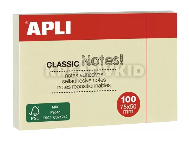 Öntapadó jegyzettömb, 50x75 mm, 100 lap, APLI "Classic", sárga