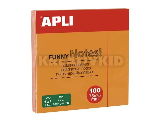Öntapadó jegyzettömb, 75x75 mm, 100 lap, APLI "Funny", neon narancs