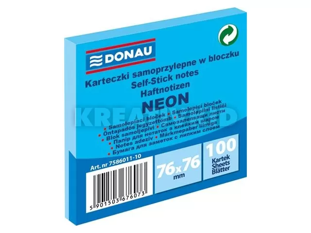 Öntapadó jegyzettömb, 76x76 mm, 100 lap, DONAU, neon kék