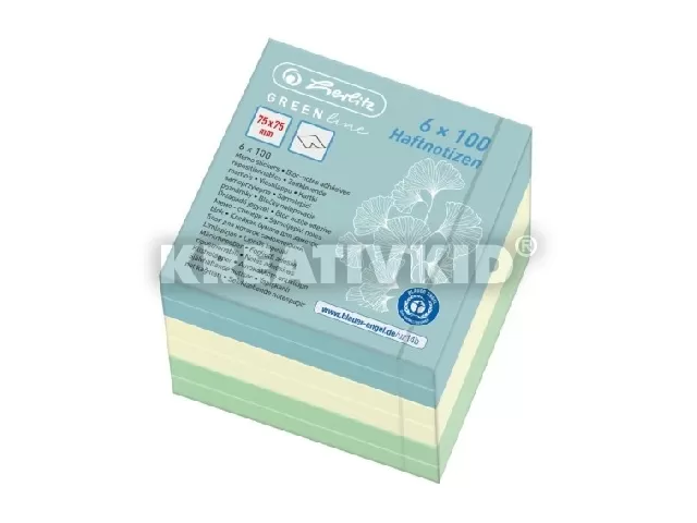 Öntapadós jegyzet GREENline 75x75mm-es méretben, 6x100 lappal, egy blokkban vegyes színek (zöld, kék, sárga), Blue Angel környezetbarát minősítéssel.
