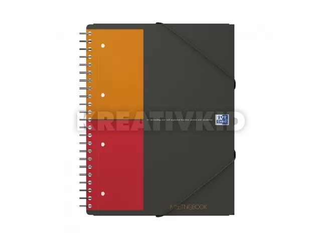 Oxford International Meetingbook A4-es méretű, 80 lapos, kockás, ikerspirálos jegyzetfüzet, hófehér belívvel, fejléccel és margóval. Erős, szakadás- és vízálló PP fedlappal. Rugalmas gumiszalaggal záródik, a füzet végén pedig egy 3 pólyás iratmappa, amelynek hosszanti pólyája könyvjelzőként is szolgál. Előre perforált és lyukasztott lapokat tartalmaz. Kompatibilis az ingyenes SCRIBZEE okostelefon-alkalmazással a jegyzetek beolvasásához, rendszerezéséhez és a dokumentumok kikereséséhez. A belívek 90 g/m2 vastagságú Optik Paper-ből készülnek, amin a tinta nem üt át, így a lapok mindkét oldalára írhat anélkül, hogy aggódnia kellene a hátoldalon lévő jegyzetek miatt. Az utolsó lap és a mappa közötti extra háttámla kényelmes írást biztosít.
