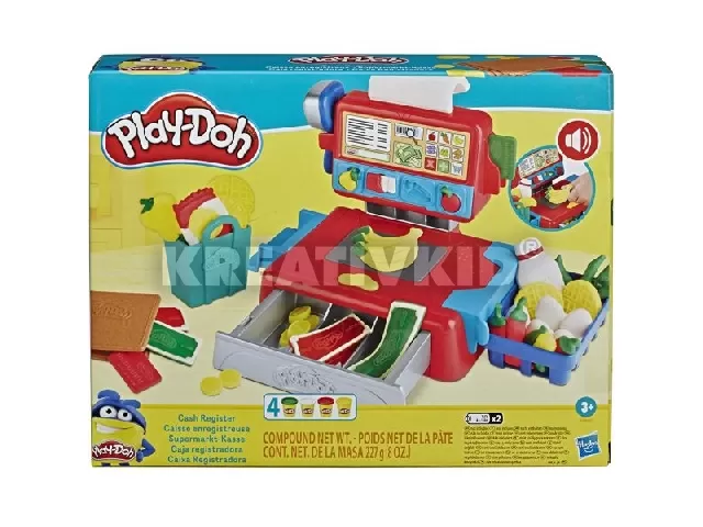 A klasszikus játék pénztárgép Play-Doh változatával kitűnően lehet boltost játszani! Nyomj vonalkódot a gyurmába a kézi leolvasóval, és amikor „leolvasod”, az elektromos pénztárgép csipogó hangot hallat. Készítsd el és húzd le a bankkártyát, vagy formázz gyurma pénzt és tedd a pénztárgép fiókjába. A pénztárgép fiókja valóban kinyílik és becsukódik, nyugtát nyomtat és már mehet is a vevő! A készlet tartalma: 5 élelmiszer szeletelő, pénztárca forma, kosár, bevásárló táska és 4 normál tégely Play-Doh gyurma. A csomag elemet nem tartalmaz.