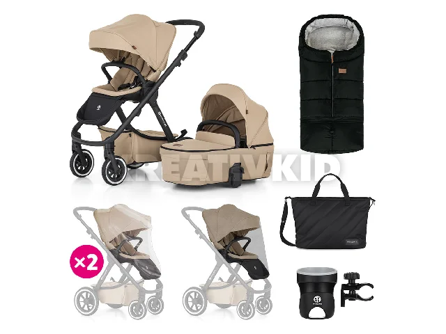 • A készlet tartalmazza: babakocsi váz, 2 x első és 2 x hátsó felfújható gumikerék, mózeskosár takaróval, sportülés, alsókosár, Maxi-Cosi adapterek, Pelenkázótáska Mia Just Black, Jibot 3in1 Ink Black bundazsák, Italtartó Handy, Rovarháló Mesh, Esővédő mély babakocsira, Esővédő sport babakocsira