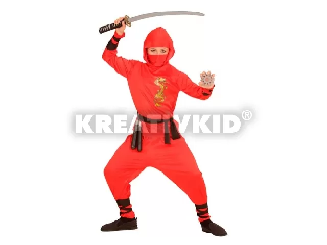 A Widmann piros ninja jelmez sárkány mintával szett tartalmaz egy piros, arany színű sárkánymintával díszített kapucnis felsőrészt, egy piros nadrágot, egy piros arcmaszkot, egy fekete övet valamint fekete kéz- és lábkötőket.