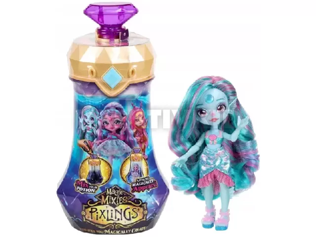 A 16 cm magas Pixlings Aqua baba könnyedén kiszedhető az üvegcséből, és több ponton mozgatható, így a gyerekek különböző pózokba állíthatják be. A Marena nevű sellő babának kék melírozott haja, sellő részletei és irizáló kiegészítői misztikus megjelenést kölcsönöznek. A baba haja fésülhető.