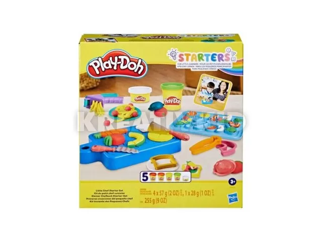 Play-Doh gyurma kezdőszett kis szakácsjelölteknek. A készletben található vágódeszka, kiszúróformák, műanyag vágóeszközök és más formázóeszközök, amelyekkel a gyerekek különböző élelmiszereket formázhatnak meg. A dobozban 5 tégely különböző színű gyurma található, amelyek mindegyike könnyen alakítható, puha és nem tartalmaz toxikus anyagokat.