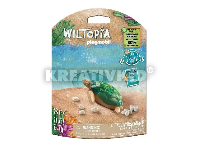 A Playmobil készlet tartalmaz egy teknőst, kiegészítőket és egy állatismereti kártyát. Az állatfigura fejét fel-le billentheti, és mind a négy lábát egyenként mozgathatja