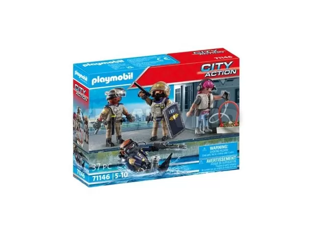 Playmobil: SWAT figuraszett 71146. Tartalma: 2 SWAT rendőr, 1 SWAT rendőrnő, 1 szélhámos, 1 sisak, 1 gumibot, 1 pajzs, 1 búvárlámpa, 1 szigony, 1 zseblámpa, 1 pisztoly, 1 feszítővas, 1 robbanószeres láda, 1 GPS, 1 fejhallgató, 1 konzolos mikrofon, 1 búváróra, 2 uszony, 1 oxigénpalack, 1 visor sisak, 1 védőmellény.