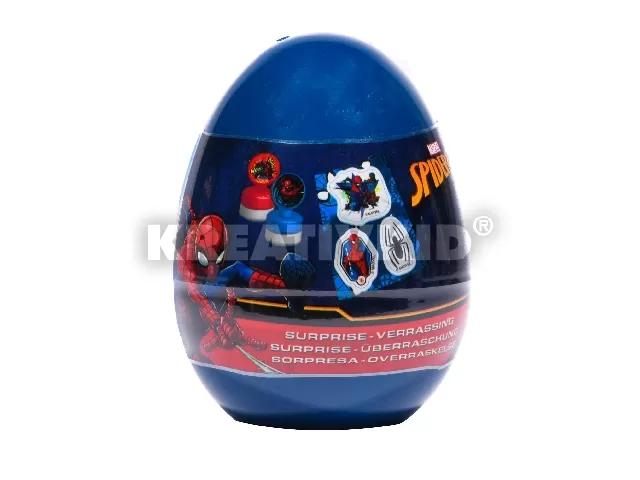 Meglepetés tojás Pókember mintával. A tojásban hegyező, radír, ceruza, nyomda és matricák találhatók. Az, hogy pontosan mi lapul a tojásban, legyen meglepetés!