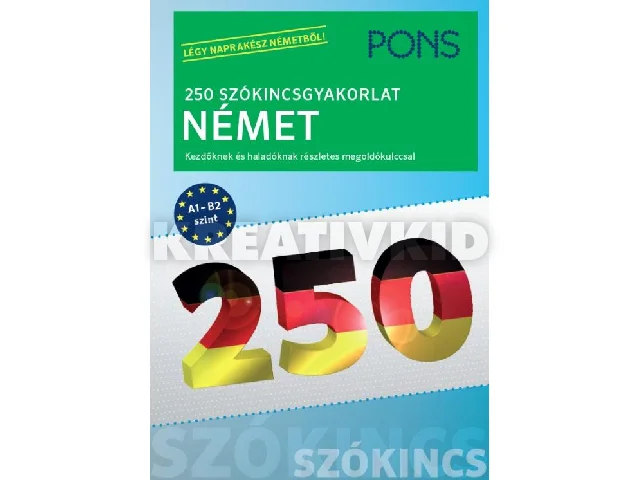 Bővítsd a szókincsed könnyedén és hatékonyan! A PONS 250 Szókincsgyakorlat NÉMET című kiadvány segítségével kis penzumokban szinten tarthatod, bővítheted vagy felfrissítheted szókincsed. Mindeközben sok ismeretet szerezhetsz a nyelvtanuláshoz szükséges legfontosabb témákról.- Gyakorold a mindennapi élet legfontosabb témáinak szókincsét 250 feladat segítségével- Válaszd a 3 nehézségi szintből a tudásodnak legmegfelelőbb feladatokat- Ellenőrizd a tanultakat könnyedén a részletes megoldókulcs használatával- Sajátítsd el a kötetbe szerkesztett nyelvtani tudnivalókat, kivételeket és a helyes kiejtést
