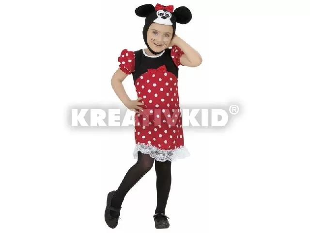 A piros-fekete jelmez elegáns, mégis kislányos megjelenést biztosít viselőjének. A puha anyagból készült, kényelmes szoknyaruha piros alapon fehér pöttyökkel tarkított, s fehér csipkeszegéllyel és fekete felsőrésszel díszített. A masnis ruha kiegészítője a fekete, fülekkel ellátott egérsapka.