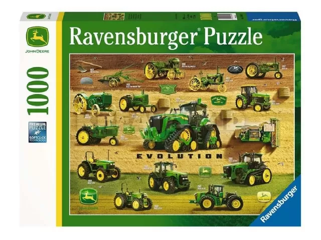 A Ravensburger 1000 db-os - John Deere Evolution című puzzle a traktorimádó gyermekek és felnőttek kedvenc kirakója. A jellegzetes zöld színű mezőgazdasági és munkagépek múltját és jelenét láthatjuk a kirakott képen.