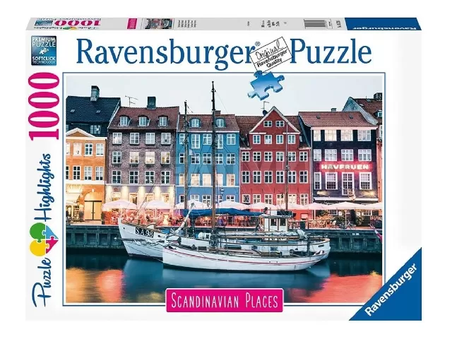 A Ravensburger 1000 db-os puzzle - képen Dánia fővárosa Koppenhága amelynek az egyik kikötőjét láthatunk.