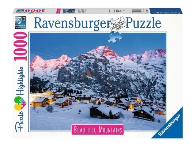 A Ravensburger 1000 db-os - Beautiful Mountains - Mürren, Bernese Oberland című képen egy tipikus svájci üdülőfalu látható. A festői szépségű Mürrent övező alpesi csúcsokról lélegzetelállító panoráma tárul a turisták elé.
