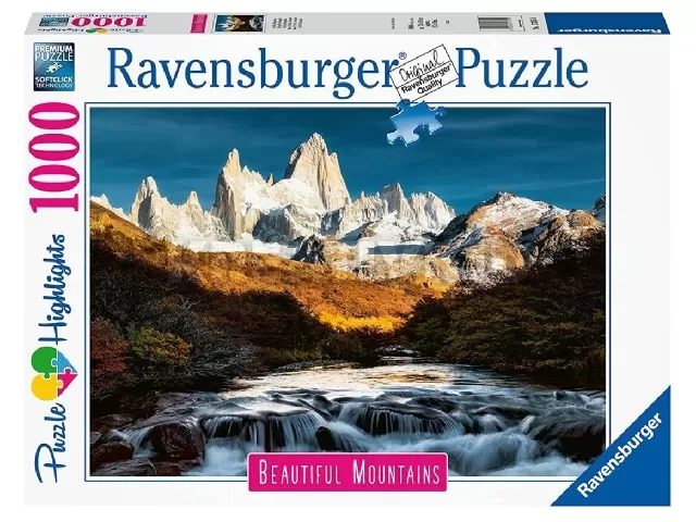 A Ravensburger 1000 db-os - Beautiful Mountains - Fitz Roy, Patagonia című képen az Argentína és Chile közt húzódó hegy és a világ legnehezebben megmászható hegycsúcsa látható. Eredeti - őslakosok által ismert - neve Cerro Chaltén, mely Füstölgő hegy-et jelent, és a hegycsúcsot általában körülvevő felhők miatt kapta.