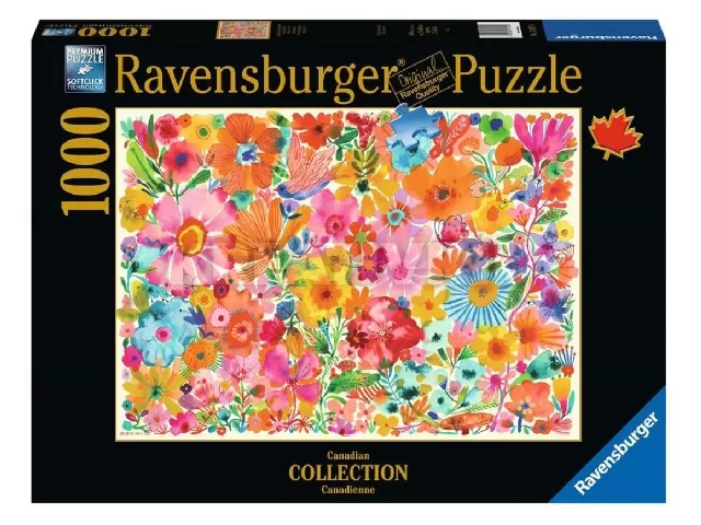 A Ravensburger 1000 db-os puzzle - Canadian Collection - Blossoming Beauties című képen Carolyn Gavin torontói festő, illusztrátor és tervező egyik szemet gyönyörködtető, színpompás virágokat ábrázoló alkotása látható.