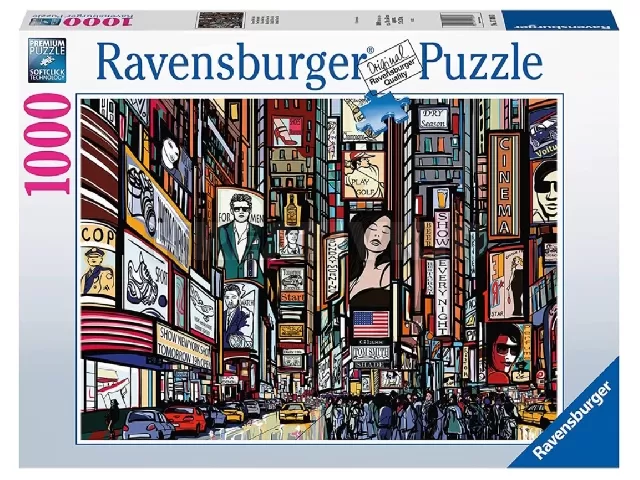 A Ravensburger 1000 db-os - Colourful New York című képen a Times Square nyüzsgő forgatagának és színes hirdetőtábláinak hangulatos illusztrációja látható.
