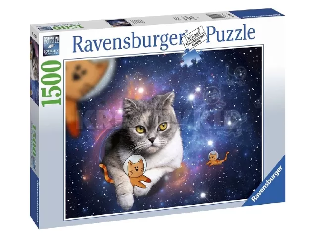 A Ravensburger 1500 db-os puzzle - Cicák az űrben című képen mókás cicák láthatók az űr végtelenjében lebegve.