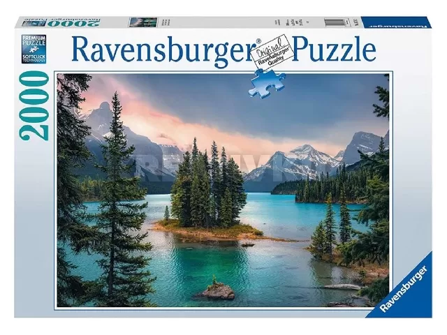 A Ravensburger 2000 db-os puzzle - Csodasziget Kanadában című képén Spirit Island látható egy apró kötött sziget ami a Maligne-tóban.