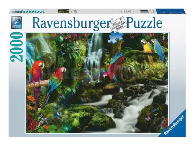A Ravensburger 2000 db-os puzzle - Színes papagájok a dzsungelben című képén a sárga-kék ara és a zöldszárnyú ara papagáj látható.