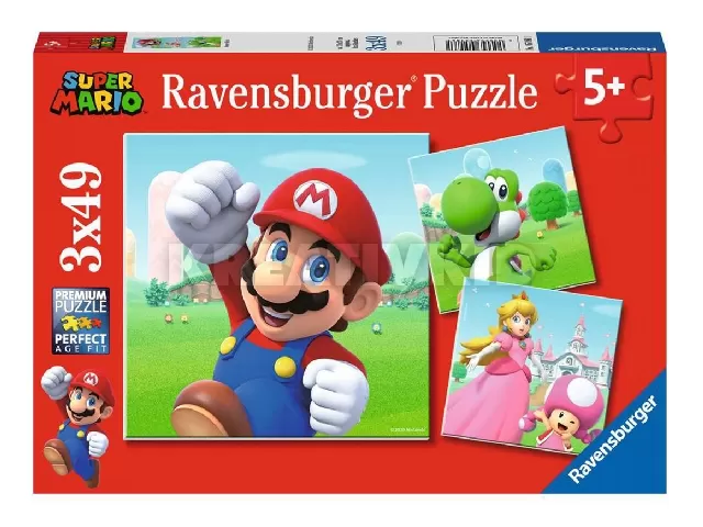 A Ravensburger 3 x 49 darabos puzzle-készlete három színes puzzle motívumot tartalmaz Super Marioval.
