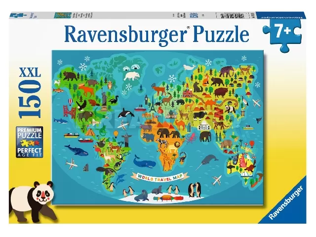 Szórakoztató és informatív puzzle megrajzolt világtérképpel. Ismerje fel az állatokat, és tanulja meg, hol élnek a világ minden táján!