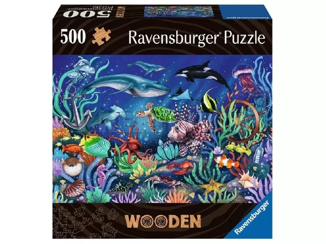 A Ravensburger 500 db-os fa puzzle - Under the Sea című képen a legkülönlegesebb vízi élőlényekkel találkozhatunk. A színpompás korallok között megjelenik a veszélyes tűzhal, a fura külsejű gömbhal, a különösen intelligens polip, fölöttük pedig a Föld legnagyobb emlőse, a Kék bálna, az ijesztő elnevezésű gyilkos bálna és egy hatalmas rája úszkál sok más tengeri állat között.