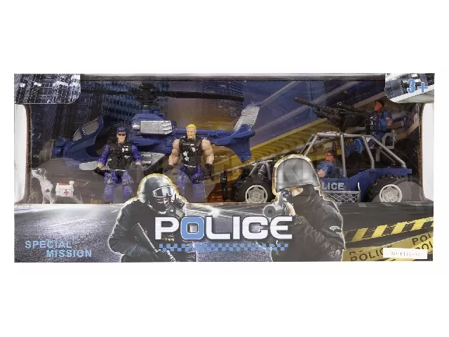Kapd el a bűnözőket a különleges kommandósokkal! A Rendőr autó és helikopter készlet figurákkal egy sötétkék műanyag helikopterből és terepjáróból áll, amit a különleges egységek használnak. A két járgány állig fel van fegyverezve, a csomagban lévő három rendőr akciófigura karjai és lábai mozgathatók, be tudod őket ültetni a járművekbe. Az osztaghoz egy kutya is tartozik, aki szintén kiveszi a részét az akcióból. A Rendőr autó és helikopter készlet figurákkal készlet együtt használható más rendőrös játékokkal is. Akciófigurák mérete: 10 cm, csomagolás méretei: 46 x 12 x 21 cm.