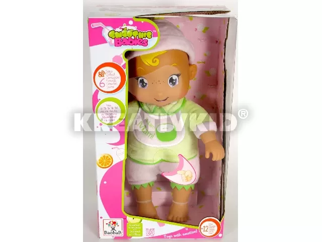 Az almazöld és világoslila színekbe öltözött babafigura szőke hajával és apró szeplőivel hódít. A stílusos baba 6 nagyszerű elektronikus hangot tud megszólaltatni. A készlet egy cumit tartalmaz.