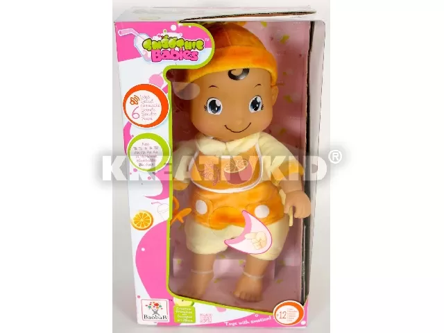 A sárga árnyalatokban pompázó lágy tapintású, biztonságos, bőrbarát anyagból készült babafigura 6 különböző elektronikus hangot tud megszólaltatni. A figura élénk sárga sapkát hord és előkét a nyakában. A csomag egy cumit tartalmaz.
