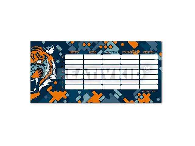 Kétoldalas, magyar nyelvű órarend A és B hét beosztással. 250 gr-os félfényes műnyomó papírra, 4 szín nyomással nyomott.