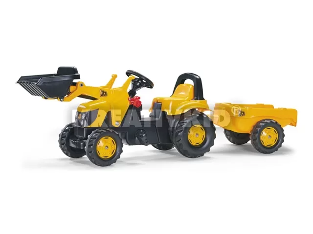 Rolly Kid méretosztályú JCB típusú pedálos traktor utánfutóval és markolóval felszerelve. A kifogástalan vezetési élményért a forgózsámolyos kormánymű felel. Az első markoló billenthető és egykezes kioldással és egykezes kanálbillentéssel működtethető. A biztonságot a biztonsági pedál garantálja. A traktorhoz utánfutó is tartozik, amelyet hátul vontat. A traktor mindezeken túl nyitható motorházzal, bukócsővel és excenteres láncfeszítővel felszerelt.