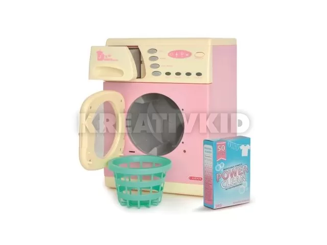 Rózsaszín elektromos mosógép, amellyel a gyerekek elsajátíthatják a mosás mikéntjét. A szett egy játék mosógépet, egy szennyeskosarat és egy mosóporos dobozt tartalmaz. A mosógép nyitható ajtóval és mosószeradagoló rekesszel rendelkezik, valamint hang-és fényeffektekkel teszi még élethűbbé a játékélményt.