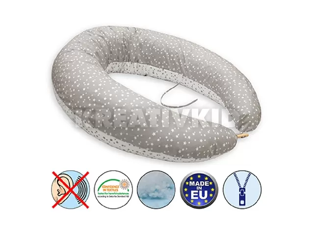 A külsõ huzat 100% pamut és szintén Ökotex minõsítéssel rendelkezik. A párna vége gombbal van ellátva a könnyebb összeerõsítés végett, a közepén egy párban kötözõ, ami a szoptatáshoz és a baba pihenéséhez nyújt segítséget.