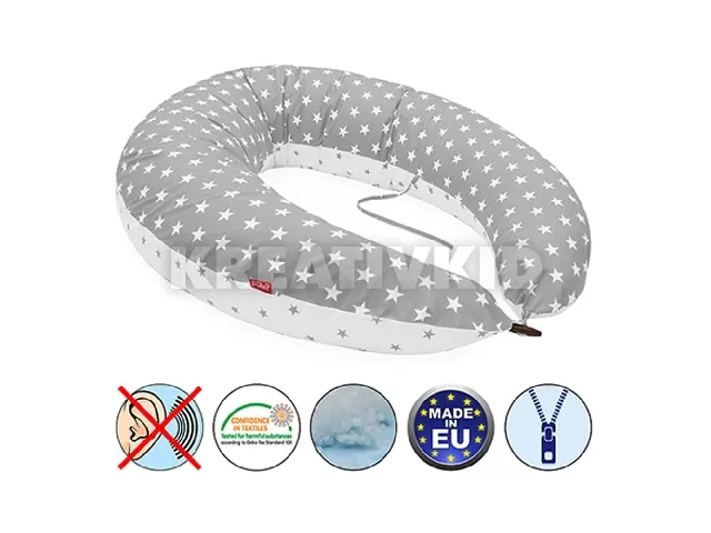 A külsõ huzat 100% pamut és szintén Ökotex minõsítéssel rendelkezik. A párna vége gombbal van ellátva a könnyebb összeerõsítés végett, a közepén egy párban kötözõ, ami a szoptatáshoz és a baba pihenéséhez nyújt segítséget.