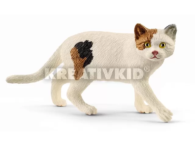 A Schleich® Farm World termékcsaládhoz tartozó amerikai rövidszőrű macska arcán és testén található gyönyörű foltok vannak: ennek a macskafajtának a nagyon izgalmas és változatos lehet szőrzetmintázata. Az állatok ragaszkodó és szelíd természetűek, aminek köszönhetően szinte mindig bekerülnek a 10 legnépszerűbb macskafajta közé. Az amerikai rövidszőrű macskák emellett nagyon intelligensek is. Például szeretik a rejtvényeket.