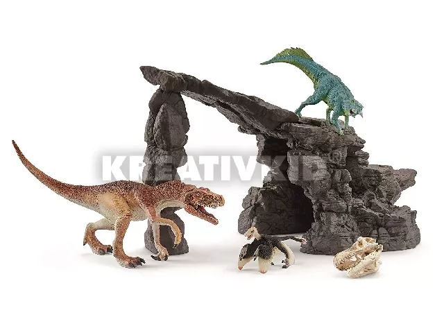 A húsevő Herrerasaurus éhesen barangol a dinoszaurusz barlang körül. A dino figura alsó állkapcsa mozgatható. A Microraptor könnyen elrejtőzhet előle, mert kicsi. De a Psittacosaurusnak csak egy lehetősége van: menekülni. A barlang eleje katapulttá alakítható.