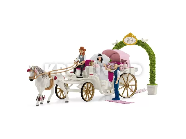 A Schleich 42641 Romantikus esküvői hintó egy gyönyörű játékkészlet a Schleich Horse Club sorozatból. A készlet tartalmaz egy esküvői hintót, a menyasszonyi pár Emily és Toby figuráit, egy lipicai ménest, valamint különböző kiegészítőket.