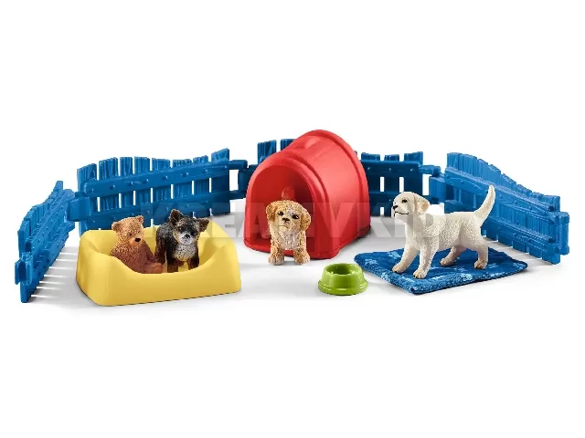 Minden Schleich® figura aprólékosan kidolgozott, szeretettel festett, és egyszerre ösztönzi a gyerekeket játékra és tanulásra. Egy maltipoo, egy csivava és egy labrador retriever együtt játszik a kölyökkutyák karámjában. Milyen izgatottak mind a hárman! Tombolnak a nyunyóka körül, versenyeznek a plüssmackóért és bújócskáznak. Majd a kutyakosárban jól megérdemelten szundikálnak.