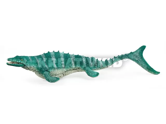 A Schleich® DINOSAURS termékcsaládhoz tartozó Mosasaurus mozgatható állkapcsa sok hegyes fogat rejt. Amikor zsákmányra, például halakra vagy teknősökre vadászott, nagyon szélesre nyitotta a száját, és erőteljesen ráharapott. Fogainak alakjából arra következtethetünk, hogy valószínűleg nem rágott, hanem egyszerűen lenyelte táplálékát. Az élőhelyhez való alkalmazkodása során mellső és hátsó lába uszonnyá alakult. Farka végén is volt egy uszony.