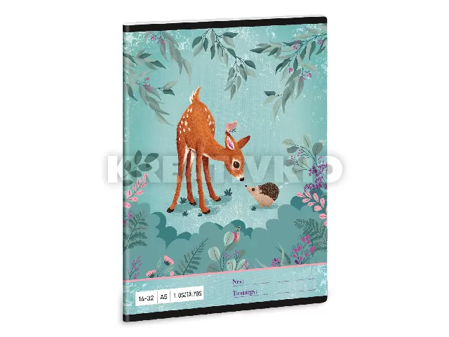 A/5-ös méretű, vonalas füzet 1. osztályos szabványos vonalazással. 32 lapos, belseje 75 gr-os papírból. Borítója 250 gr-os műnyomó kartonra lekerekített sarkokkal, fényes fóliázással, 4 szín nyomással készült.